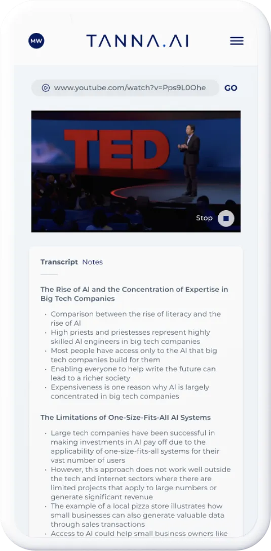Automatically create notes, and then view and edit your notes with ease. Tanna AI's innovative approach to studying and note-taking optimizes your efficiency and effectiveness, freeing you to fully concentrate on the speaker. This powerful tool makes learning accessible to all students, regardless of disabilities or language barriers. Try Tanna AI today and unlock a whole new level of smart studying.